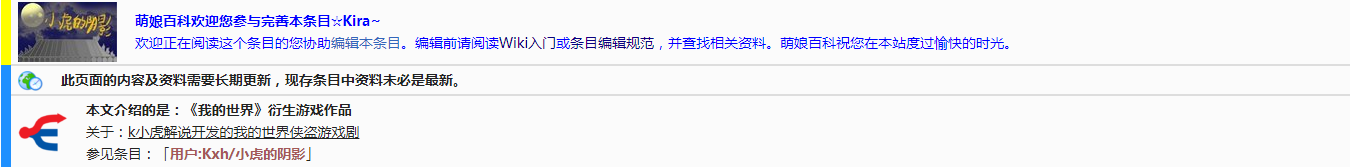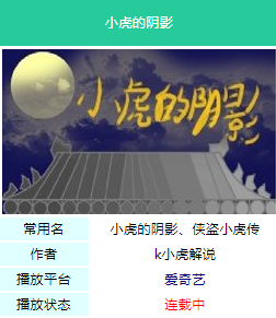 小虎的阴影由(k小虎解说)独立创造,是一个我的世界游戏剧,该游戏剧讲述了一位名为小虎的盗贼在各个地方行窃的故事,途中与各个保安斗智斗勇,到第二部被授予了“怪盗”称号。 本系列每部有五集,第一部第一集因未知原因而下线,小虎的阴影共5集(第一集下线后有4集),小虎的阴影2:神秘的顽共5集