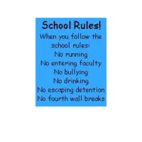 No running No entering faculty No bullying No drinking No escaping detention No fourth wall breaks
